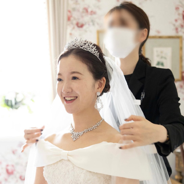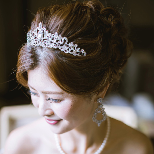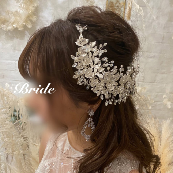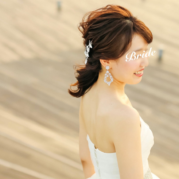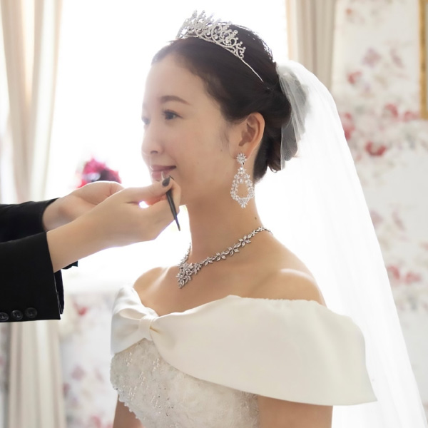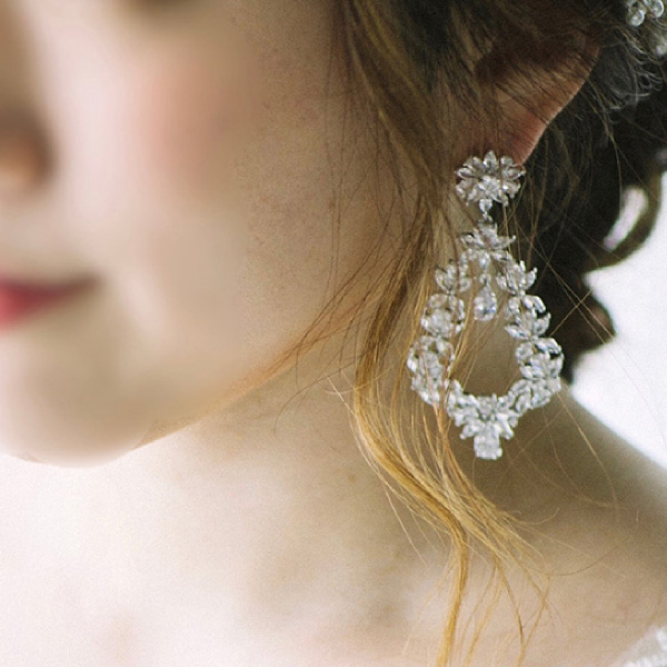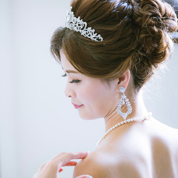 ベーシックで正統派なデザインでありながら、留め具のフラワーモチーフと中央のドロップが可愛らしさも演出します。エレガントスタイルにも、ナチュラルウェディングのアクセントとしても活躍するアクセサリーです。