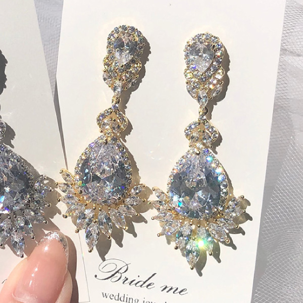 大きくカットされたジルコニアが圧倒的な存在感を放つ、大振りのロングピアスです。