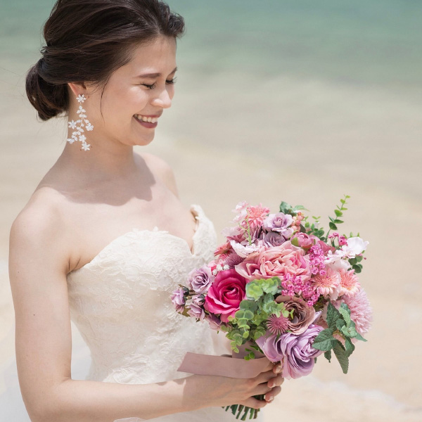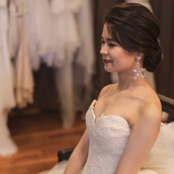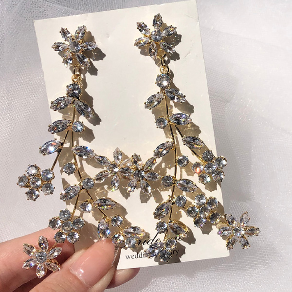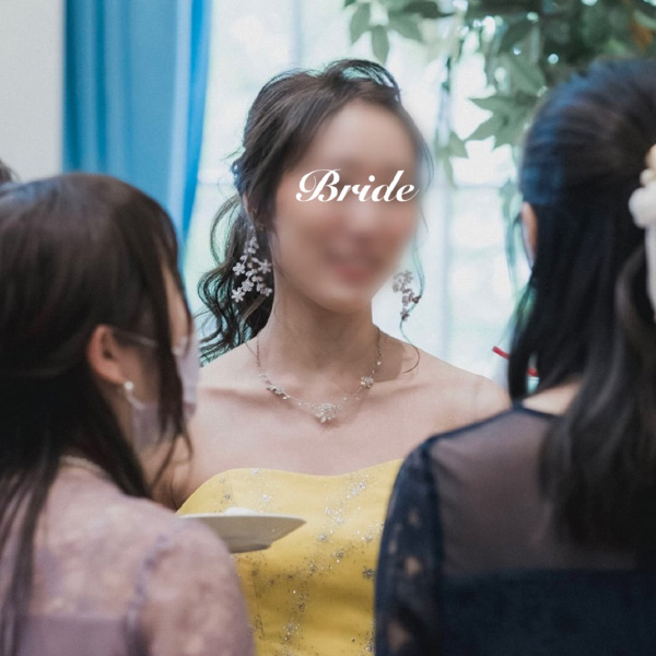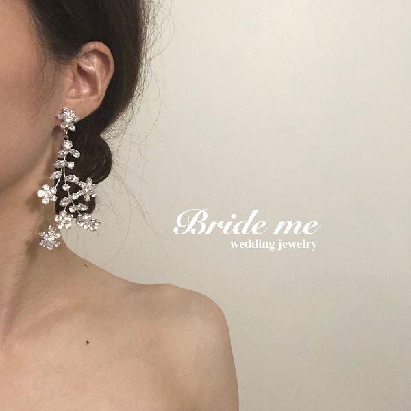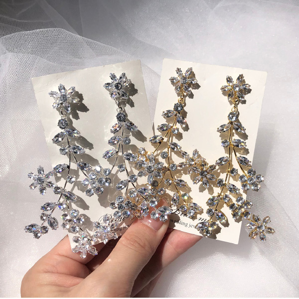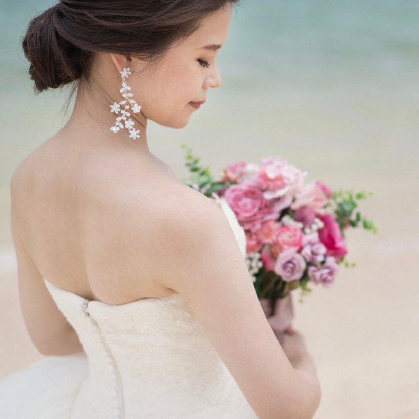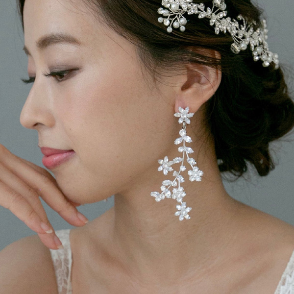 お花を散りばめたようなデザインが、華奢で可愛らしい雰囲気を演出してくれるゴールドのアクセサリーです。全体的に大振りで動きのあるデザインが、ゲストの目を惹きます。散りばめられたジルコニアが、花嫁様のお顔周りを華やかに見せてくれます。ゆるくまとめた海外風のヘアスタイルと相性がよく、アクセントになります。