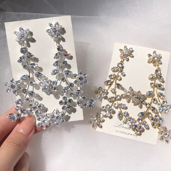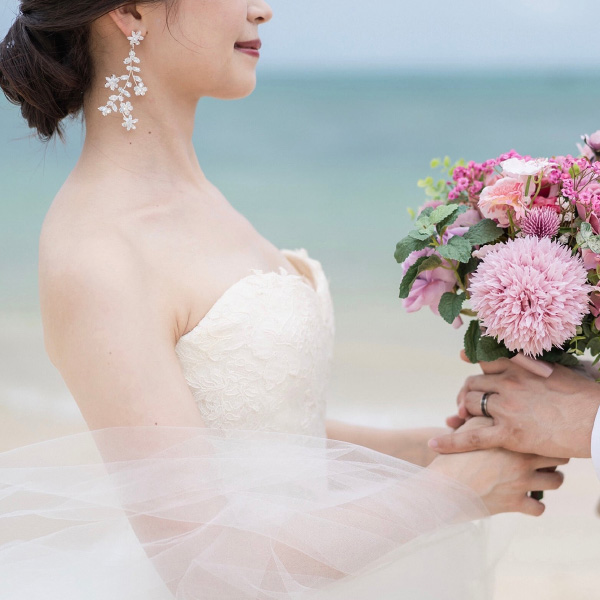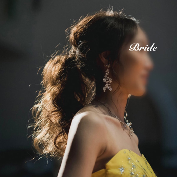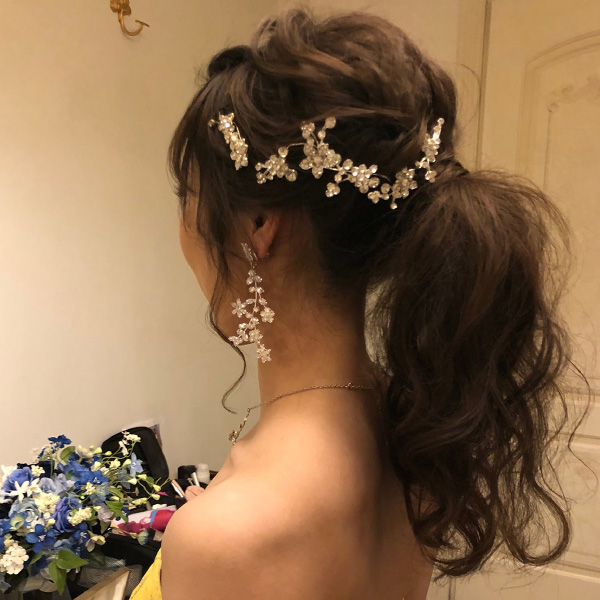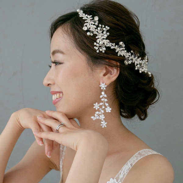 お花を散りばめたようなデザインが、華奢で可愛らしい雰囲気を演出してくれるシルバーのアクセサリーです。全体的に大振りで動きのあるデザインが、ゲストの目を惹きます。散りばめられたジルコニアが、花嫁様のお顔周りを華やかに見せてくれます。ゆるくまとめた海外風のヘアスタイルと相性がよく、アクセントになります。