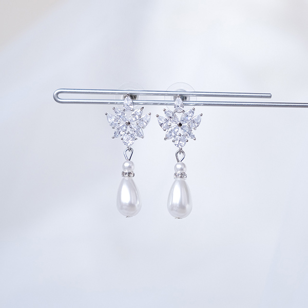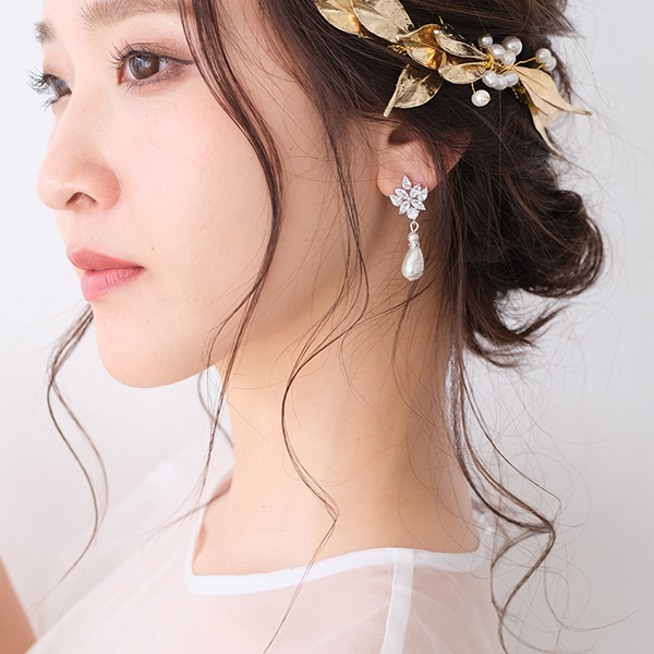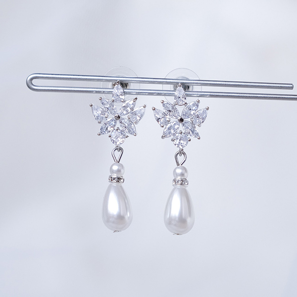ダイヤモンドのような輝きを持つジルコニアとブライダルにぴったりなパールのピアスで、