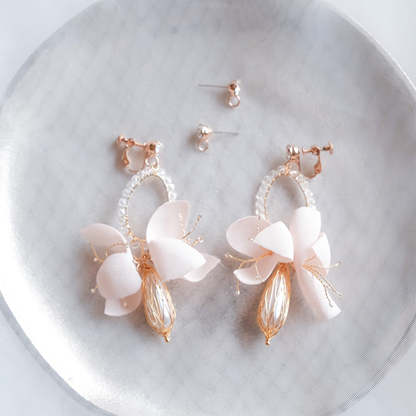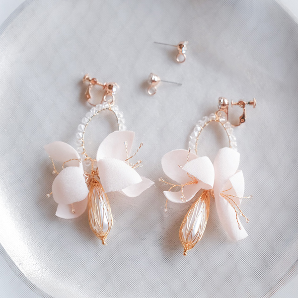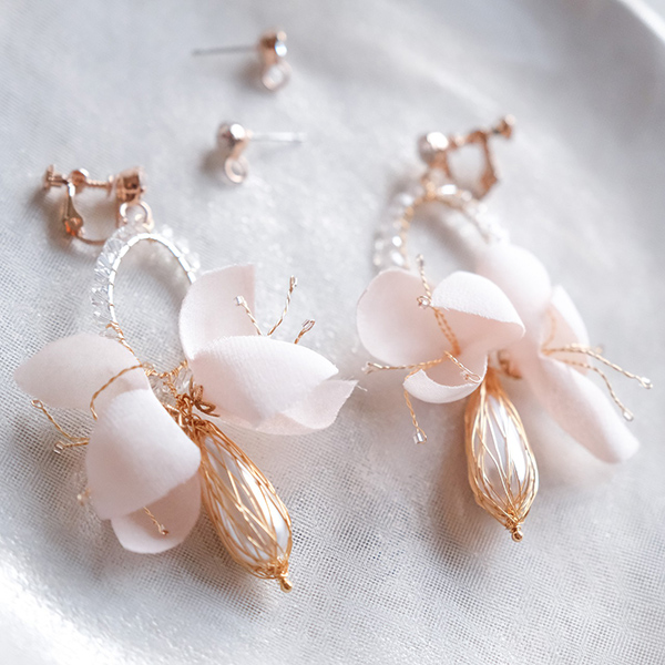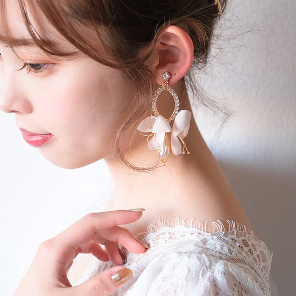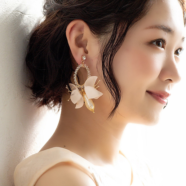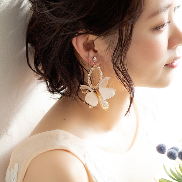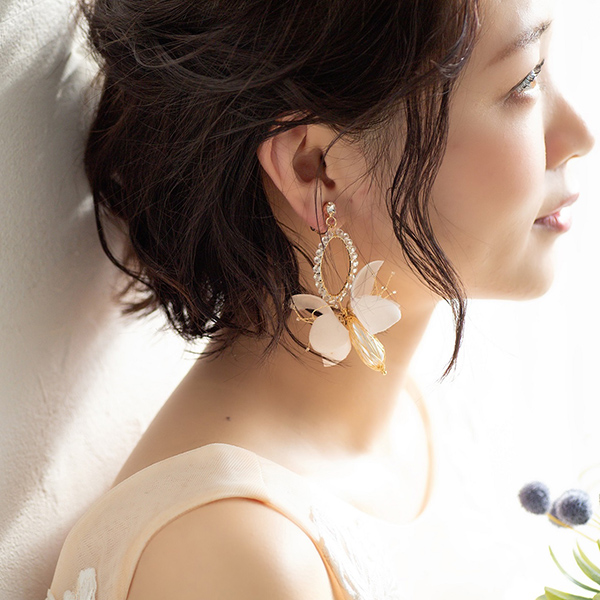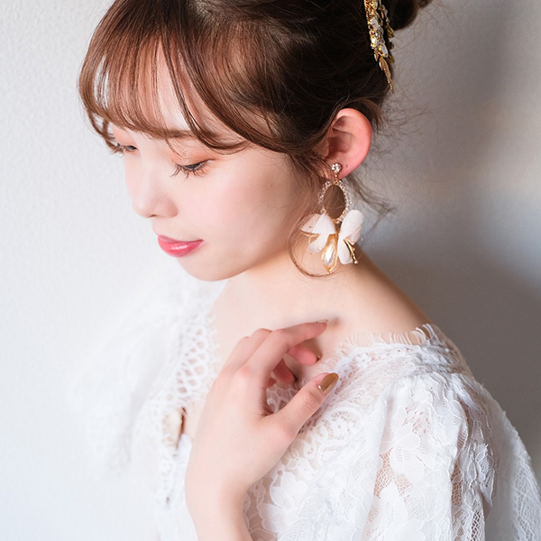 大振りの菱形デザインが美しい、ジルコニアのピアスです。動くたびにジルコニアがキラキラと輝き、花嫁様の横顔を華やかに見せてくれます。縦長のシルエットなので、お顔回りをシャープに見せてくれる効果もあります。存在感のあるピアスなので、ノーネックレススタイルでも十分華やかです。ウェディングドレスはもちろん、カラードレスとの相性も抜群のアクセサリーです。