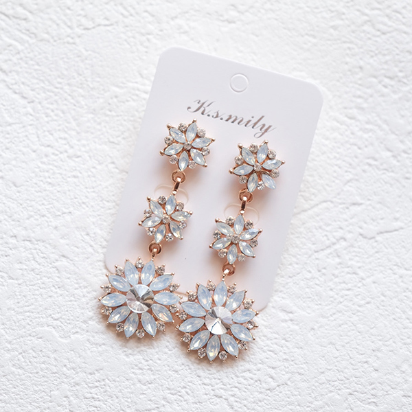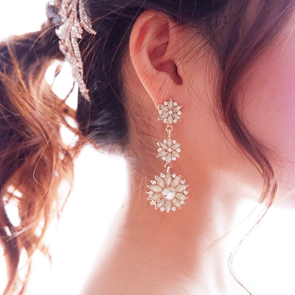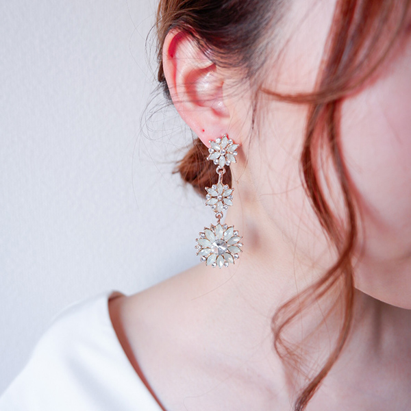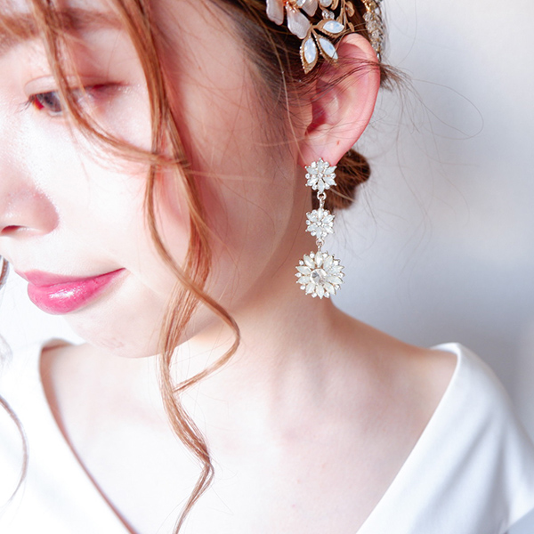 ビジューをたくさん使われた可愛くて上品なデザインで、どんなドレスでも似合うピアスになっています。