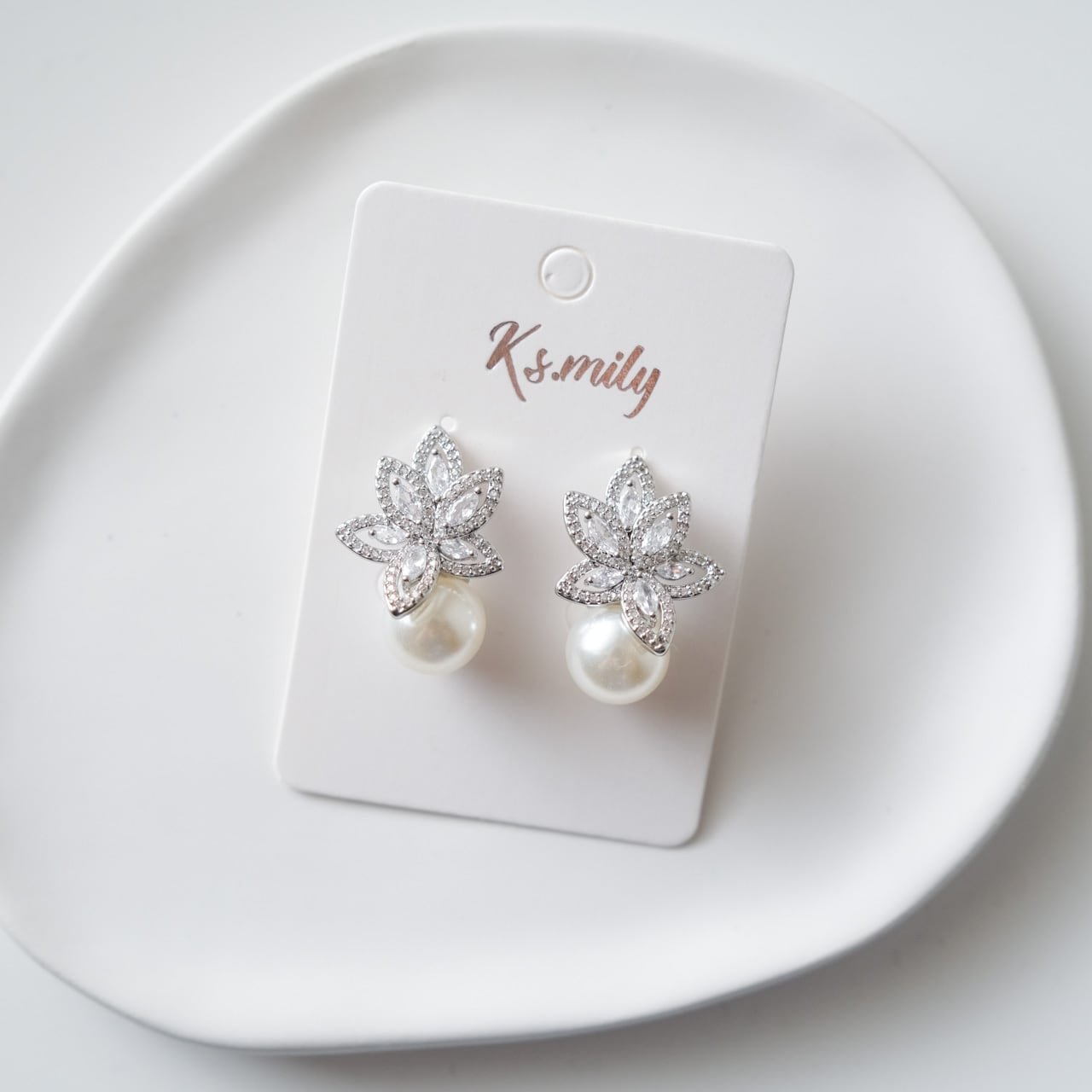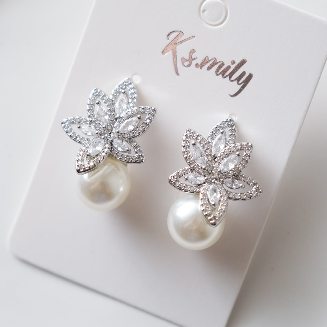 ビジューとパールのブライダルピアス で、ビジューのフラワーデザインがとてもキュート。