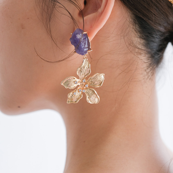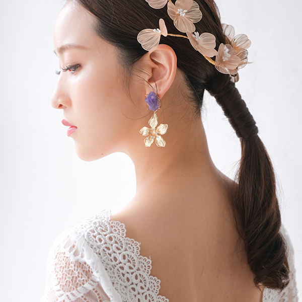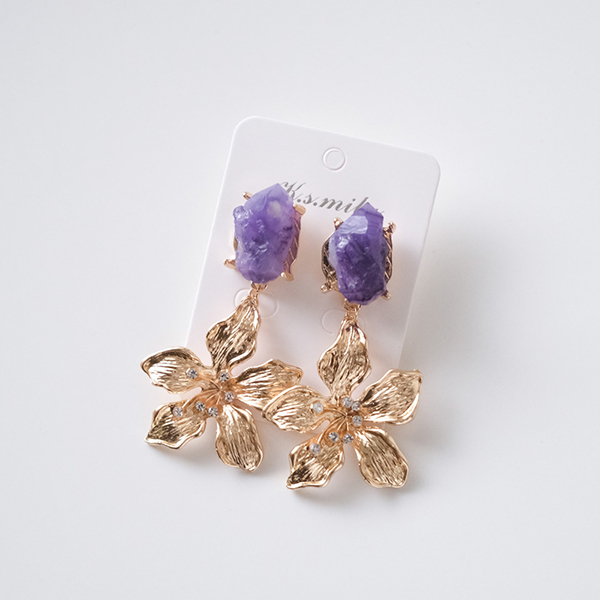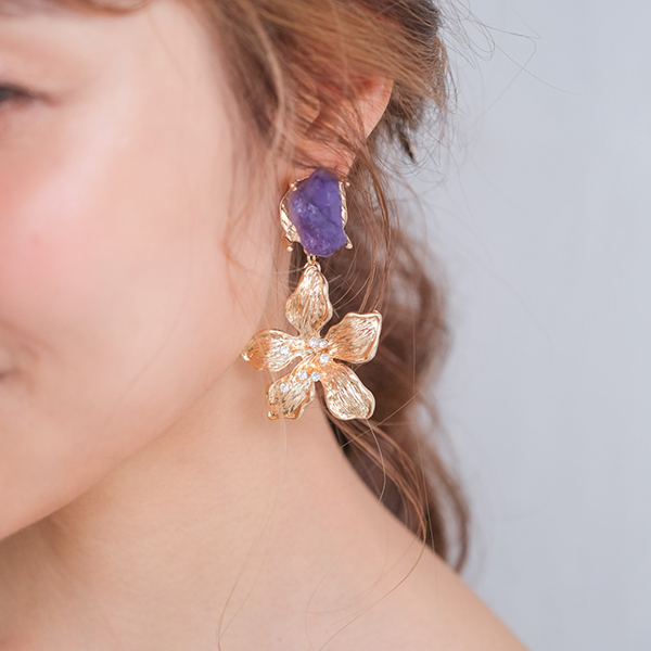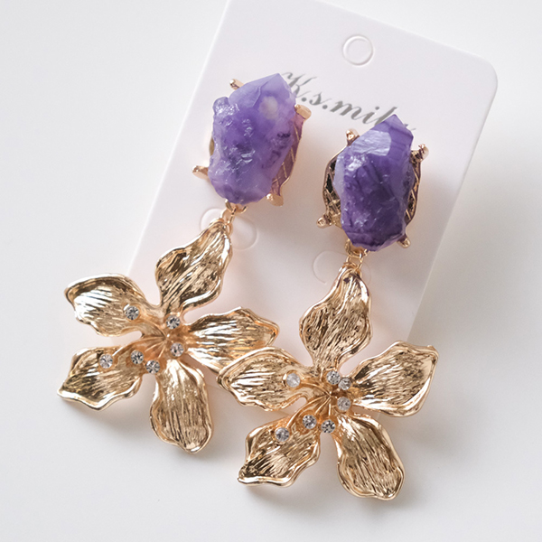 ゴールドフラワーとパープルストーンのアンティーク風ピアスが耳元を華やかに!!