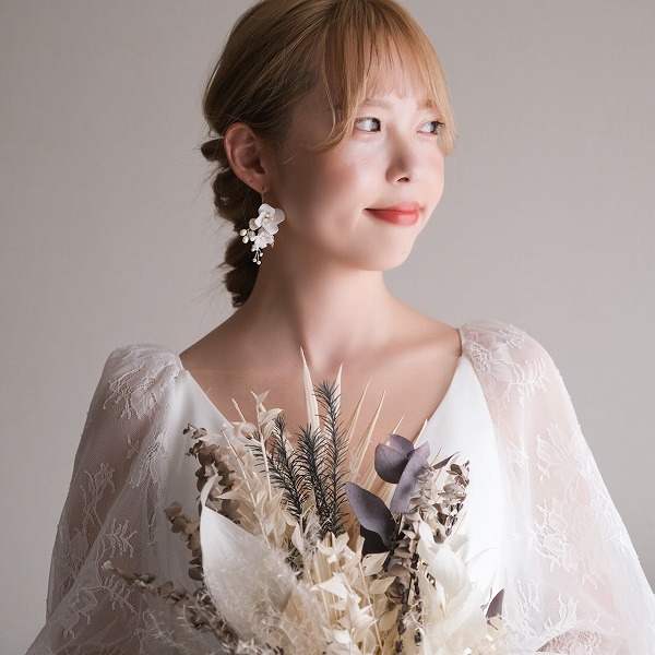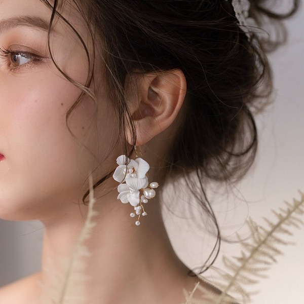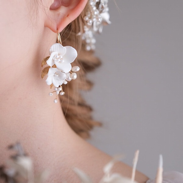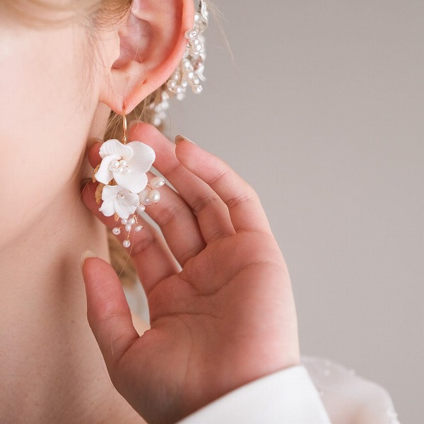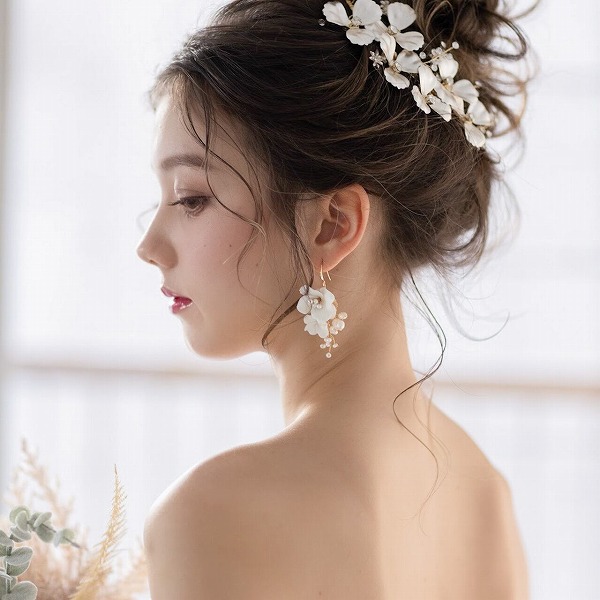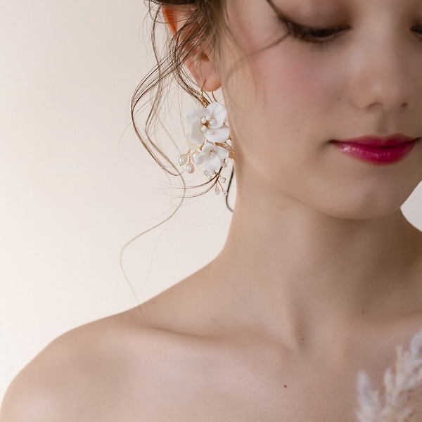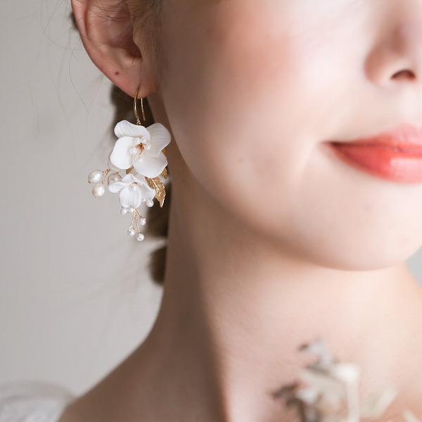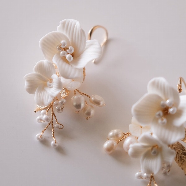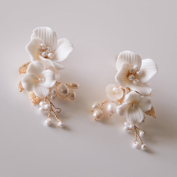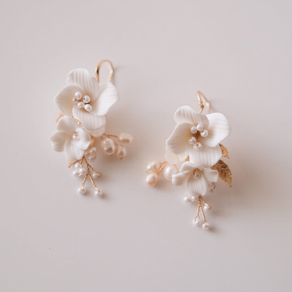 ホワイトフラワーとゴールドリーフの小枝ピアス。おしゃれ花嫁様にピッタリ!これ1つでウェディングが華やかになりますよ♪