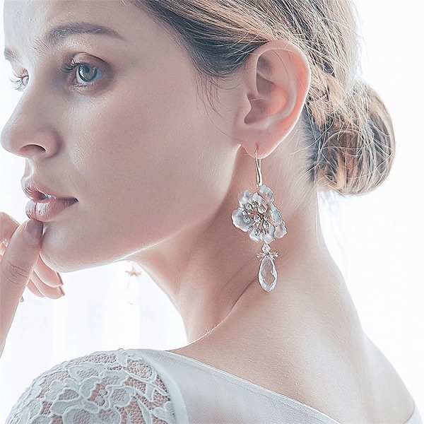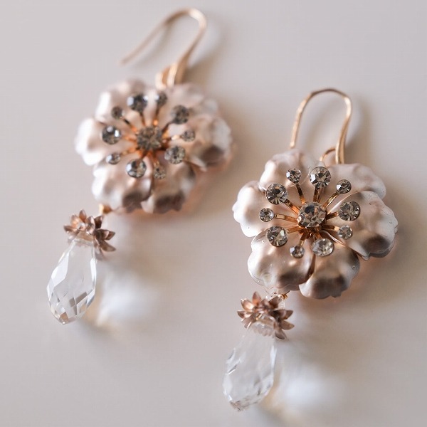 ピンクゴールドフラワーとクリスタルピアス。ヨーロッパのレトロ感があるナチュラルデザインです。これ1つでウェディングが華やかになりますよ♪