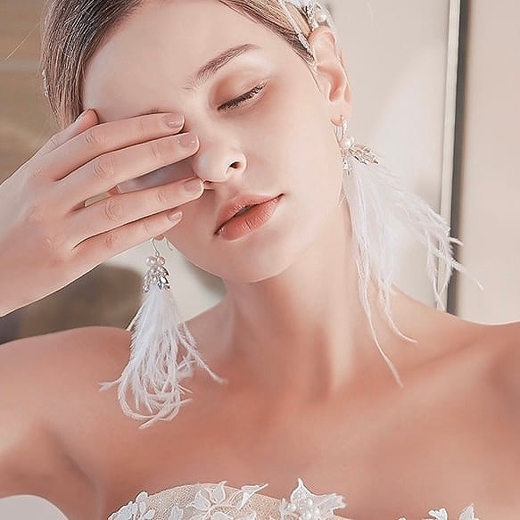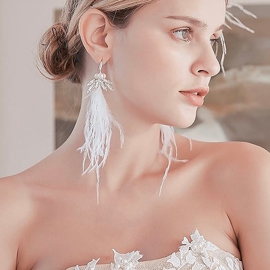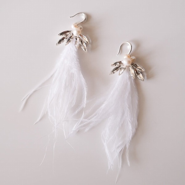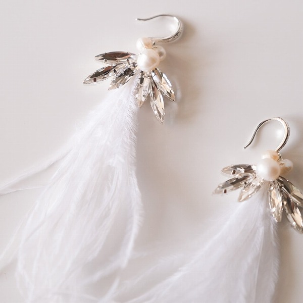 ホワイトフェザーとパールとビジューを使ったデザイン。フェアリー花嫁になれるおすすめピアス!これ1つでウェディングが華やかになりますよ♪