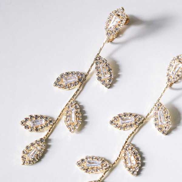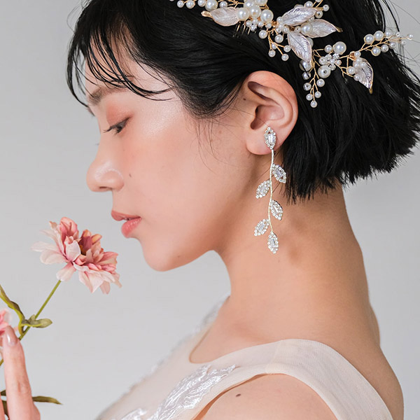 シンプルながらも上品なビジューリーフデザインのブライダルピアスです。