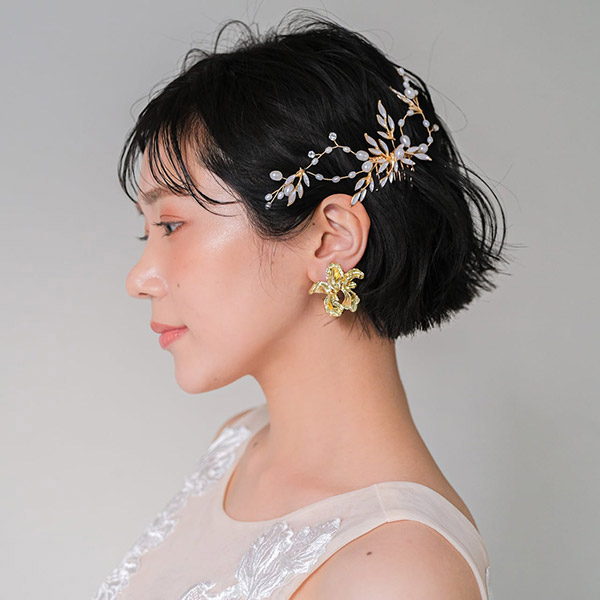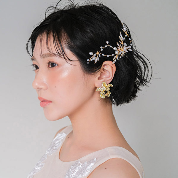 ゴールドカラーの光沢感と繊細なディティールによるフラワーの美しさが、見る者の心をひきつけます。まるで花を耳元に咲かせたかのようなデザイン♪この一品を身につけるだけで、あなたのウェディングドレスが一層輝きます。