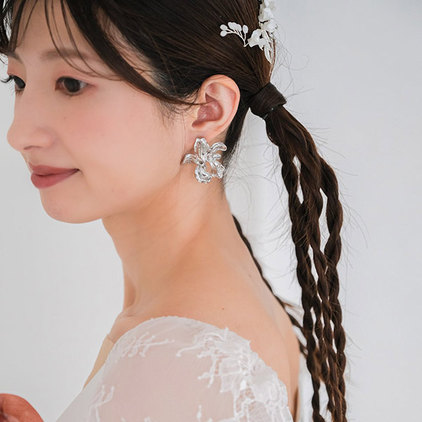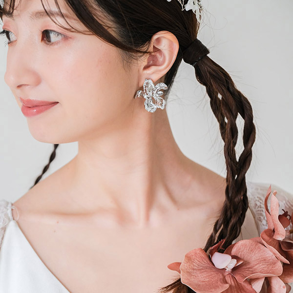 シルバーカラーの光沢感と繊細なディティールによるフラワーの美しさが、見る者の心をひきつけます。まるで花を耳元に咲かせたかのようなデザイン♪この一品を身につけるだけで、あなたのウェディングドレスが一層輝きます。