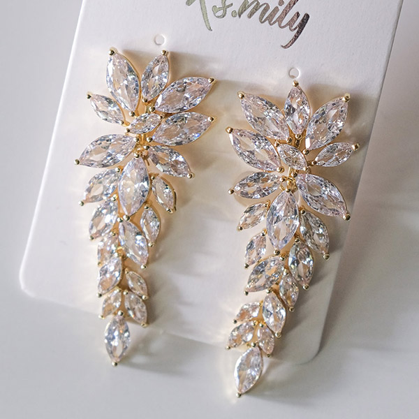 ジルコニアの輝きが、まるで本物のダイヤモンドのような輝きと美しさを放つ、ゴールドカラーのブライダルピアス。