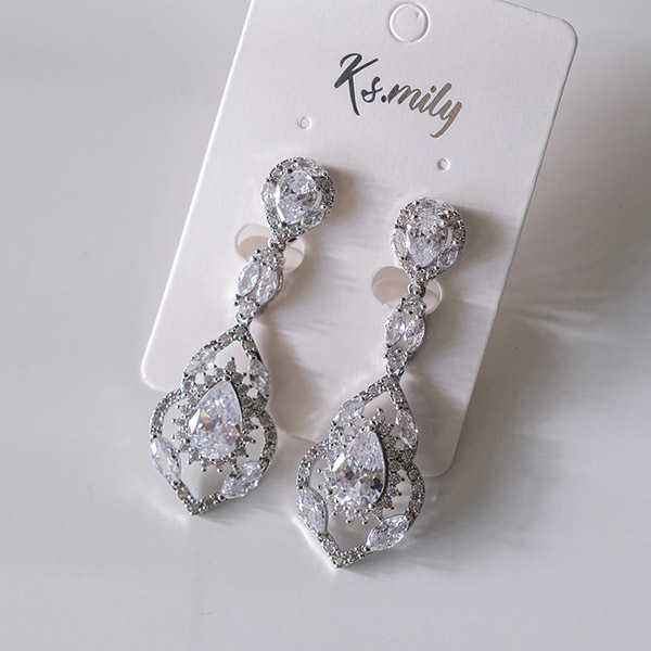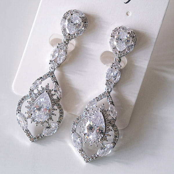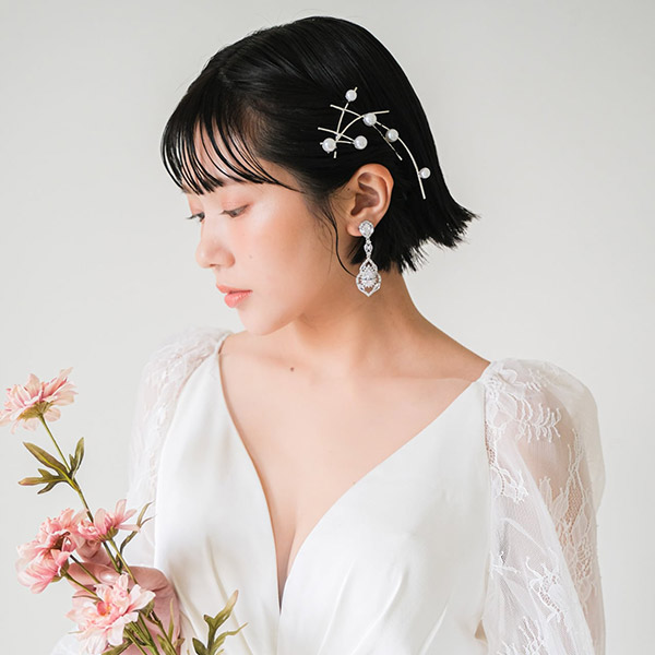 ジルコニアの輝きが、まるで本物のダイヤモンドのような輝きと美しさを放つ、シルバーカラーのブライダルピアス。