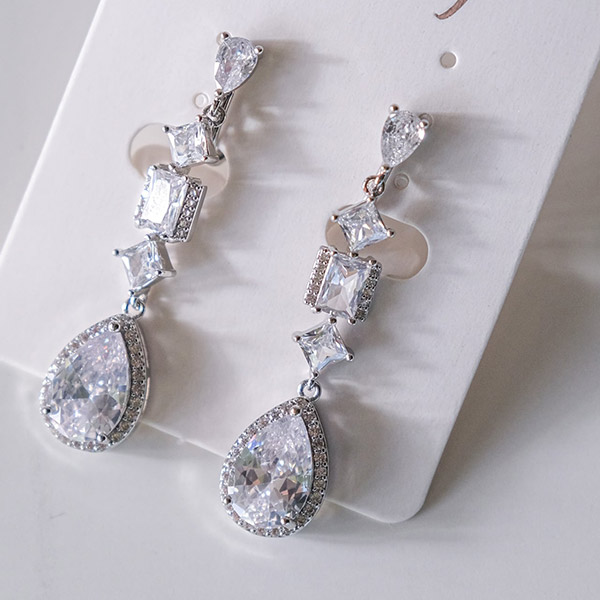 ジルコニアデザインの個性的なカットが、輝きと美しさを放つ、シルバーカラーのブライダルピアス。