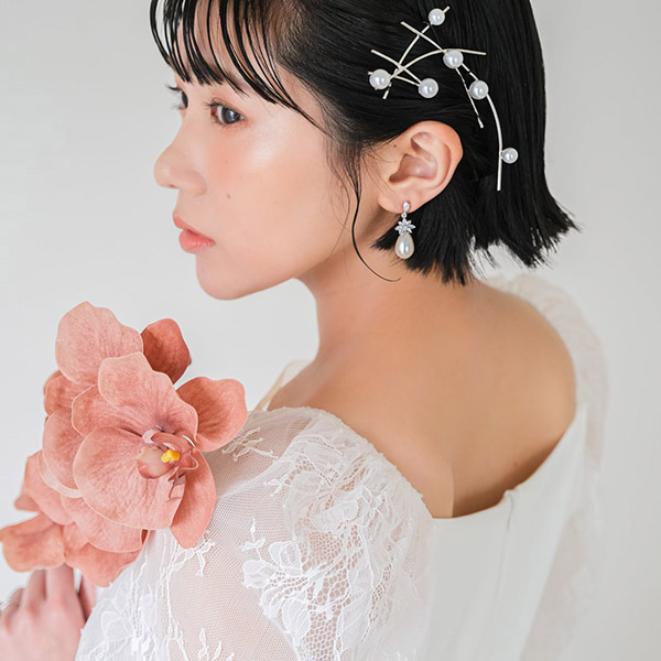 輝くジルコニアと上品なパールの組み合わせが美しいシルバーカラーのブライダルピアス。
