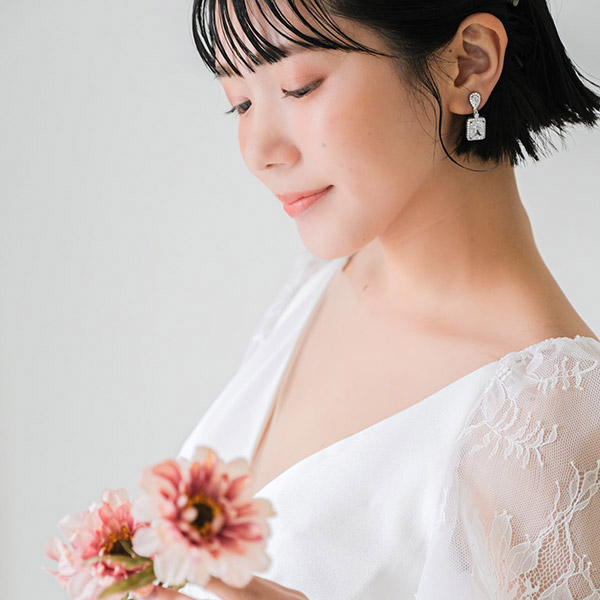 輝きに満ちたスクエア型のジルコニアが、スマートに魅せてくれる美しいシルバーカラーのブライダルピアス。