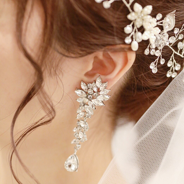 リーフのロングピアス。クリスタルストーンが華やかなロングピアスで、存在感のある洗練されたデザインで大人上品な花嫁に..。