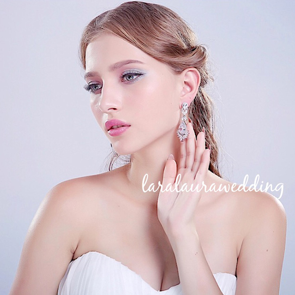ジルコニアストーンをふんだんに使ったピアス。しっかりと存在感があるのでお顔周りも明るく…。遠くのゲストまで輝く揺れるピアスで華やかな花嫁に…。