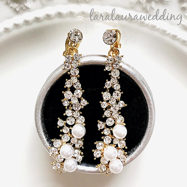 パールとクリスタルストーンのピアス。ゴールド地金にクリスタルストーンとパールをバランスよく埋め込んでおります。コーディネートを選ばない人気のデザインです。