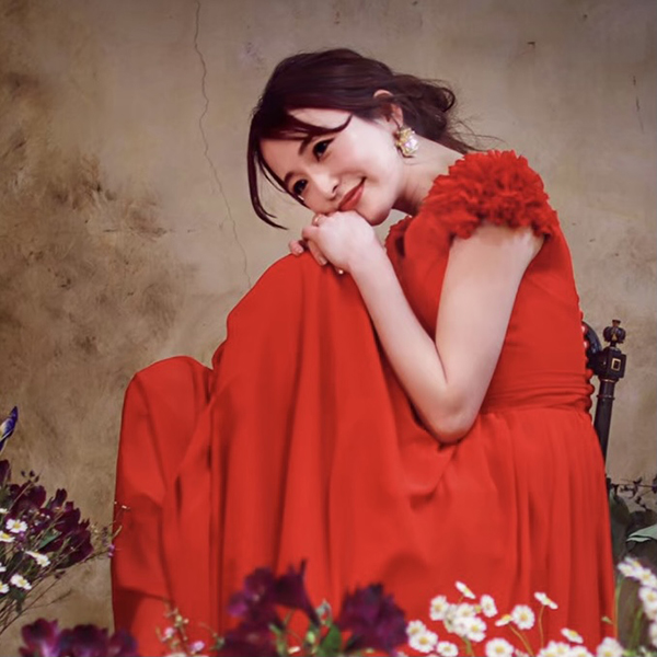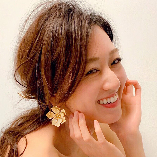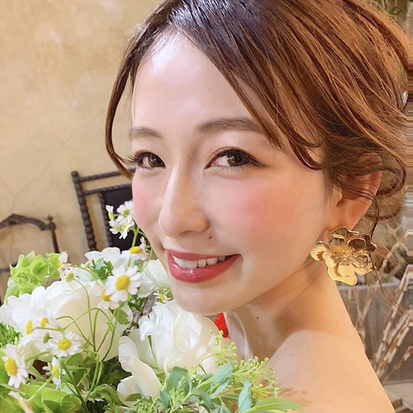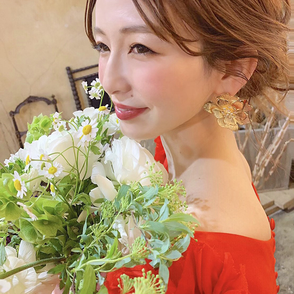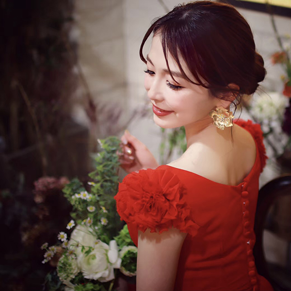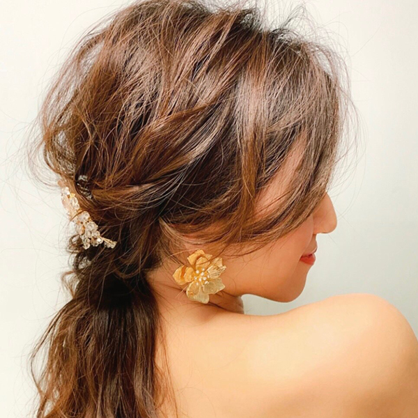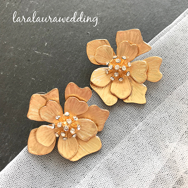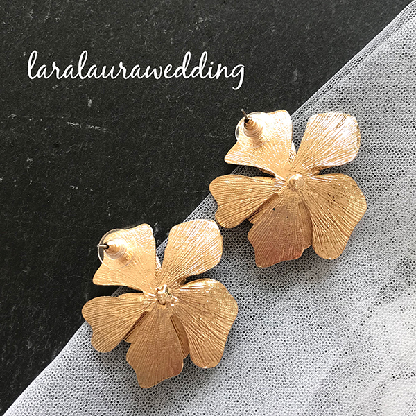 ゴールドフラワーのピアス。シンプルなフラワーのピアス。レースのドレスや、カラードレスにあわせて、フラワーのワンポイントでよりおしゃれな花嫁に。