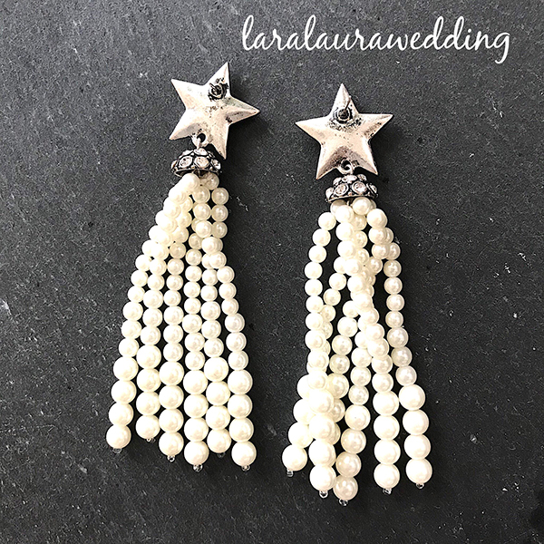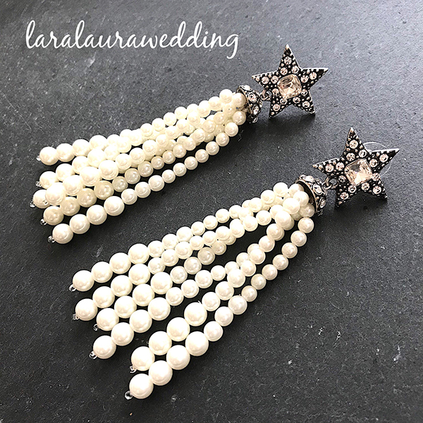 トレンドアイテムでオシャレ花嫁に。スターモチーフ、ホワイトパールとタッセルピアスでオシャレです。