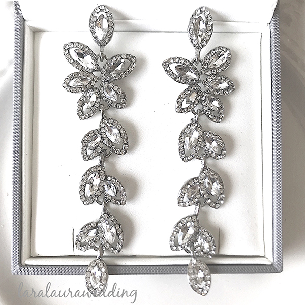 クリスタルストーンのリーフロングピアス。華奢なデザインですが、長さがしっかりとあるため女性らしく華やかにお召しいただけます。リーフモチーフはヘッドドレスとの相性もよく合わせていただけます。