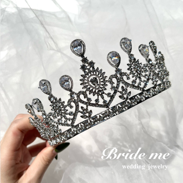 まるで王族のティアラの様なロイヤル感は品格あふれるウェディングティアラ。キラキラのビジューを敷き詰めた華やかさは花嫁コーデの要になること間違いなし!ホテルなどの大きな会場にもよく映えるアクセサリーです。大ぶりのデザインで花嫁様のお顔周りをより一層華やかに演出します。