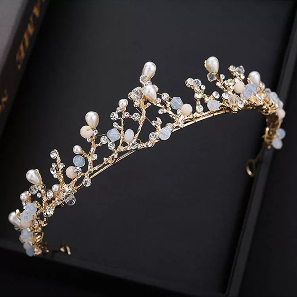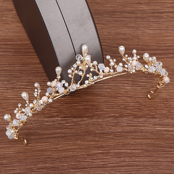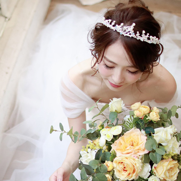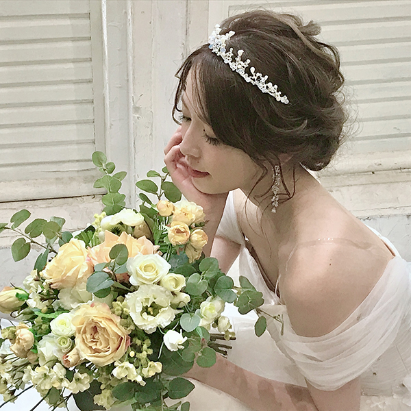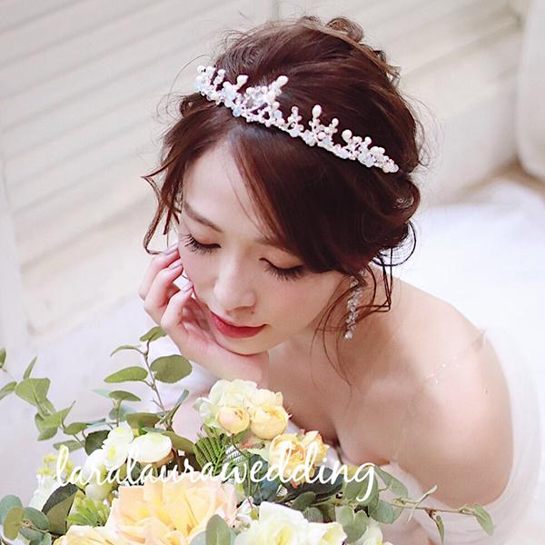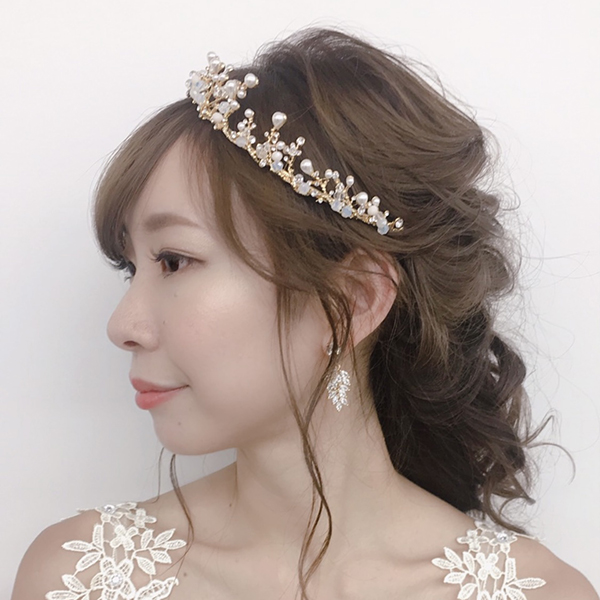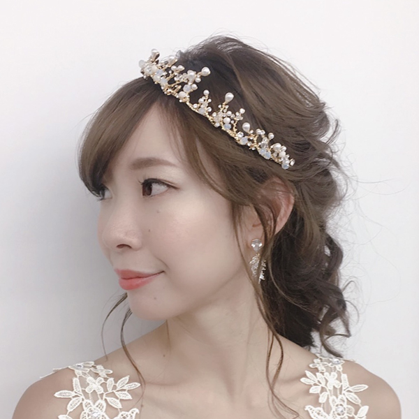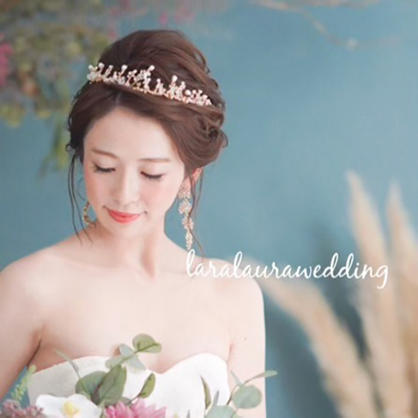 ナチュラルなティアラ。小枝のような華奢なフレームに、パールや乳白色のビーズをバランスよくあしらったティアラ。珍しいゴールドカラーで他の花嫁様と差をつけて。ドレスやヘアスタイルによって、ナチュラル、大人かわいいなどなりたい花嫁の雰囲気に…。