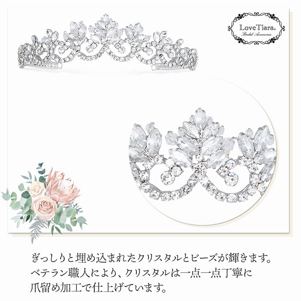 クラシカルかつお洒落なティアラマーキスクリスタルでかたどった葉っぱの様なモチーフがとてもクラシックかつお洒落。正面のスカラップフォルムが上品なデザインです。サイドまで輝く珍しいデザインで正面だけでなくサイドまでクリスタルがぎっしり。サイドまでクリスタルが付いているティアラはとても珍しく、正面・横どこから見ても輝き注目度も抜群です。合わせやすいフラットな高さで、正統派からスタイリッシュなドレスまで、合わせやすいデザインです。お洒落なスタイルがいい!そんな花嫁様にお勧めなのがオデッサティアラです。葉モチーフの様でクラシカルでお洒落。アンダーのスカラップ (波打つ) フォルムがとても美しいデザインです。ベテラン職人により、 クリスタルは一点一点丁寧に爪留め加工で仕上げています。