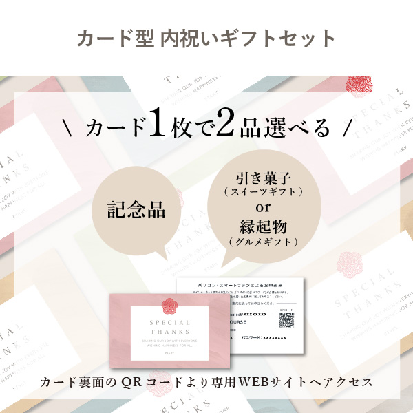 円受け取った方が欲しいものを選べる、ハイクオリティで圧倒的低価格なカードタイプの内祝いギフト。カード型内祝いギフトセットは貰った方がカードに印字されたQRコードをスマホで読み取り、裏面のQRコードから自分で欲しいギフトを選べます!トレンド感溢れるカードデザインはもちろん、1品選ぶだけのカタログギフトとは違って、品物ギフト・スイーツギフト・グルメギフトの中から2〜3品選ぶことができるので、ワンランク上のお返しが叶います!カード型内祝いギフトセットは内祝いを贈る側も贈られる側も便利でスマートなおもてなしを叶えてくれます。