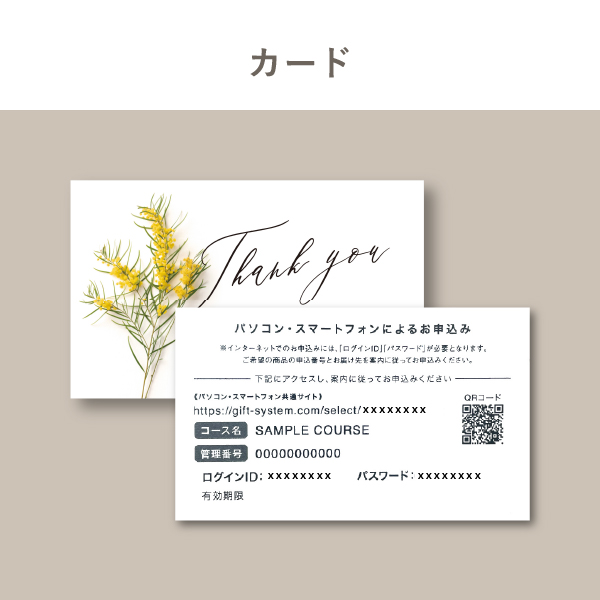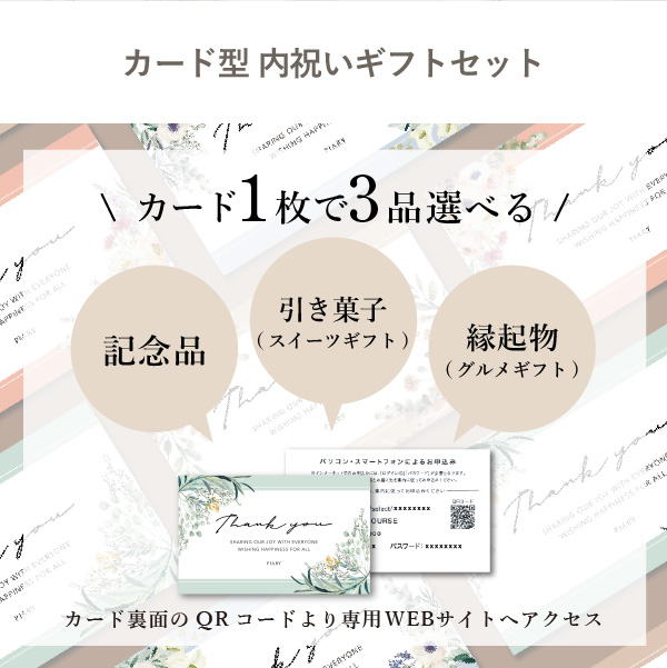 円受け取った方が欲しいものを選べる、ハイクオリティで圧倒的低価格なカードタイプの内祝いギフト。カード型内祝いギフトセットは貰った方がカードに印字されたQRコードをスマホで読み取り、裏面のQRコードから自分で欲しいギフトを選べます!トレンド感溢れるカードデザインはもちろん、1品選ぶだけのカタログギフトとは違って、品物ギフト・スイーツギフト・グルメギフトの中から2〜3品選ぶことができるので、ワンランク上のお返しが叶います!カード型内祝いギフトセットは内祝いを贈る側も贈られる側も便利でスマートなおもてなしを叶えてくれます。