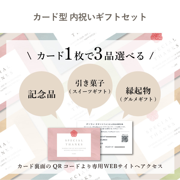 円受け取った方が欲しいものを選べる、ハイクオリティで圧倒的低価格なカードタイプの内祝いギフト。カード型内祝いギフトセットは貰った方がカードに印字されたQRコードをスマホで読み取り、裏面のQRコードから自分で欲しいギフトを選べます!トレンド感溢れるカードデザインはもちろん、1品選ぶだけのカタログギフトとは違って、品物ギフト・スイーツギフト・グルメギフトの中から2〜3品選ぶことができるので、ワンランク上のお返しが叶います!カード型内祝いギフトセットは内祝いを贈る側も贈られる側も便利でスマートなおもてなしを叶えてくれます。