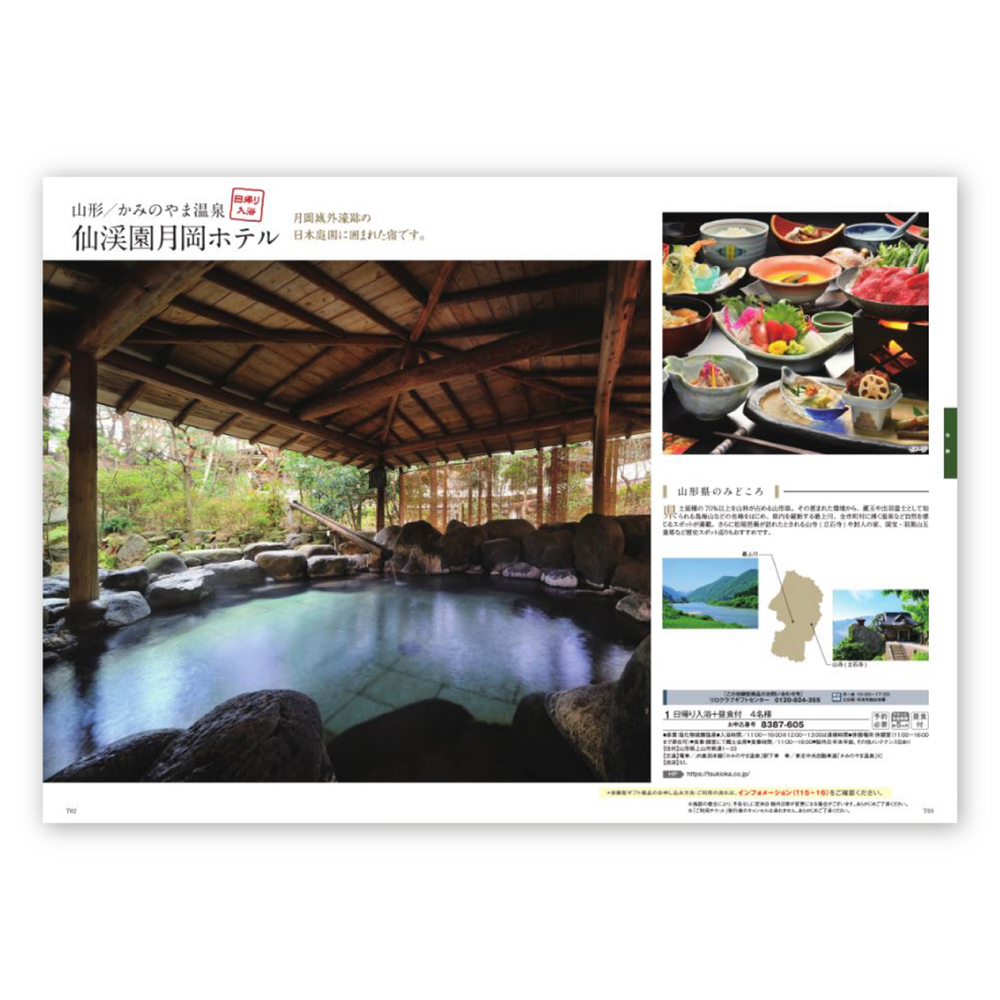 カタログギフトで人気な体験型ギフトでは、温泉のペアチケットやレストランのディナーなど特別なひとときをご用意。山形県のかみのやま温泉「仙渓園月岡ホテル」は日本庭園に囲まれた、美しい景色をゆっくりとご堪能いただけます。