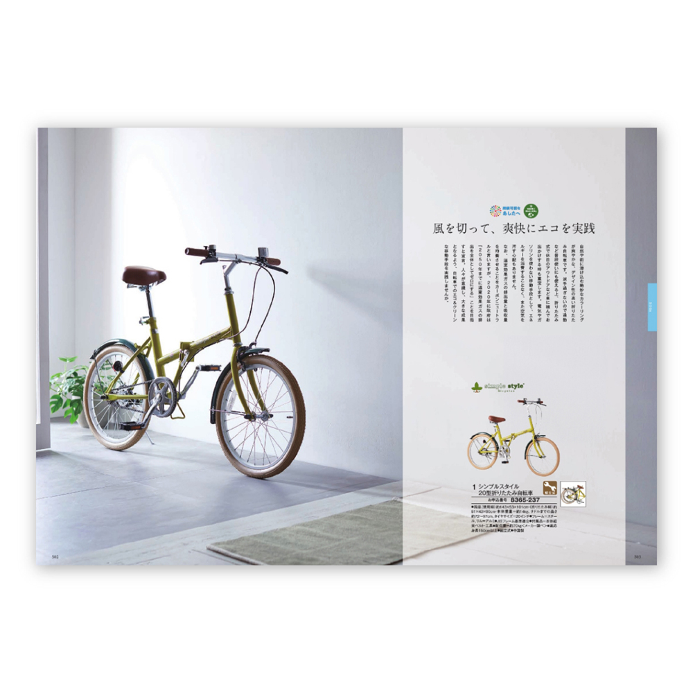 近年耳にする、「持続可能なあしたへ」ということでSDGsに特化したアイテムも掲載しています。「シンプルスタイル」の20型折りたたみ自転車はデザイン性の高い折りたたみ自転車です。休日のアウトドアなど車に積んでお出かけする時も重宝し、電気やガソリンを使わない移動手段として空気を汚す心配もありません。