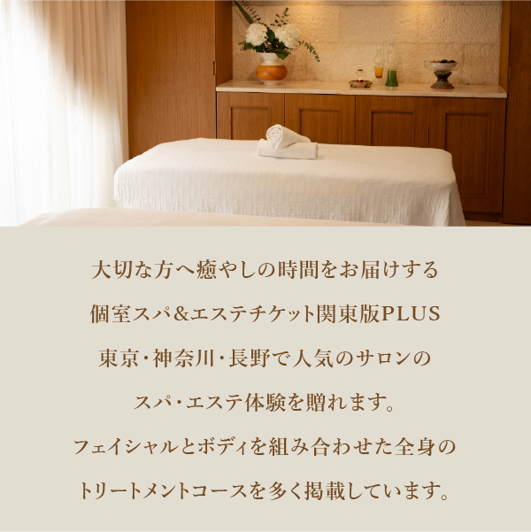コスメブランドの直営サロンからホテルスパまで。東京・神奈川・長野で人気のサロンのスパ・エステ体験を贈れます。選べるサロンのラインナップがより豊かに、メニューもより充実した内容を取り揃えました。フェイシャルとボディを組み合わせた全身のトリートメントコースを多く掲載しています。