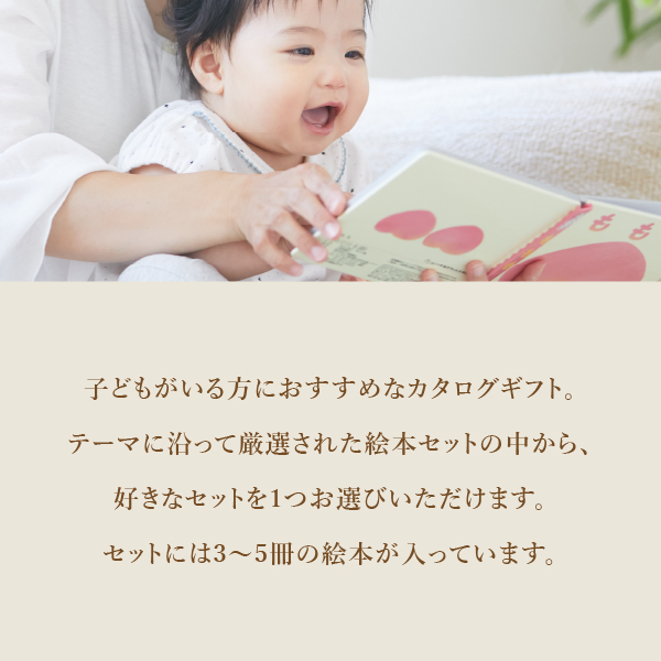 子どもや自分の好みに合わせて、好きな絵本を選べるギフト。テーマに沿って厳選した3-5冊の絵本セットを、複数ご用意しました。好みや被りの心配なく安心して贈れるように。受け取った人が好きな絵本に出合えるように。0歳用の定番絵本から、長く楽しめるストーリーのしっかりした絵本まで、幅広くセレクトしました。出産祝いを始め、1歳の誕生日プレゼントや、子どもがいる方へのプレゼントにおすすめです。