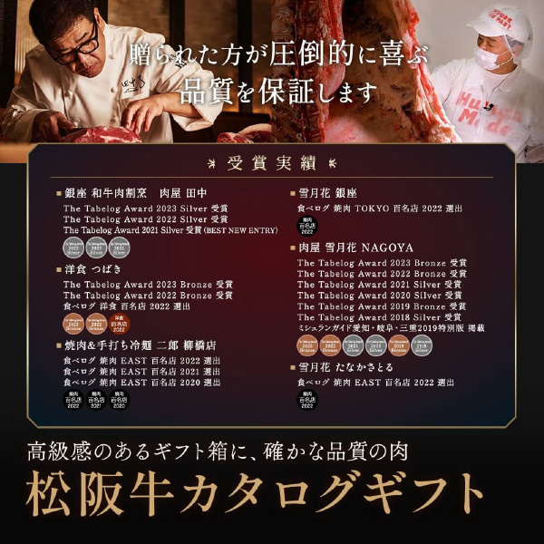 「おいしい肉を、お腹いっぱい食べて欲しい」「和牛の本当の美味しさを伝えたい」そんな思いから国産和牛(松阪牛・黒毛和牛・飛騨牛・近江牛)を集めました。精肉店だからできる誰にでも親しみやすい上質なお肉を扱うことで、家族で楽しめるおいしいお肉をご提供。一頭買いにこだわり、グルメな方の期待にも応える最高な技術と安定した品質を自信をもってお贈りします。ミシュラン掲載・食べログ受賞歴多数のレストランを含店舗運営している肉師たなかさとるが贈るカタログギフト。高級感のあるギフトボックスで、確かな品質と感動を。