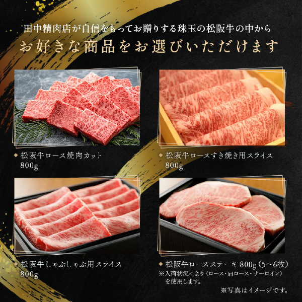 こちらのコースは、松阪牛ロース焼肉カット800g、松阪牛ロースすき焼き用スライス800g、松阪牛しゃぶしゃぶ用スライス800g、松阪牛ロースステーキ800gの4商品の中からお好きな商品をお選びいただけます。