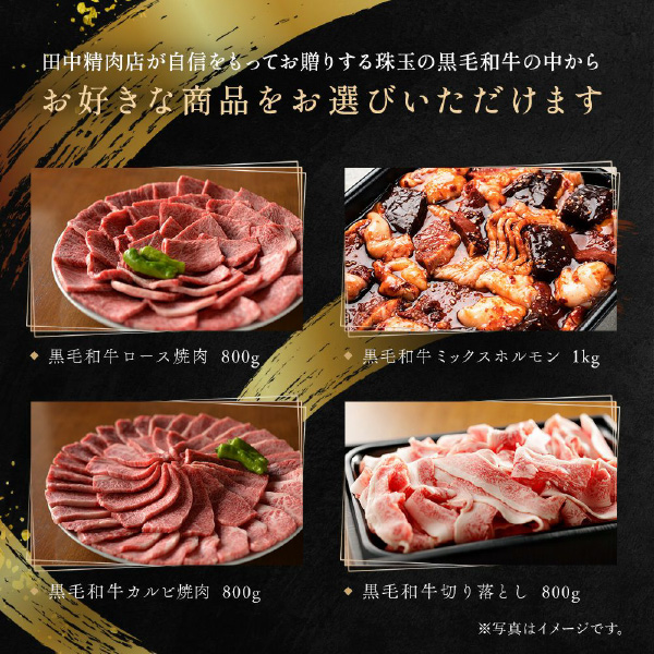 こちらのコースは、黒毛和牛ロース焼肉800g、黒毛和牛ミックスホルモン1kg、黒毛和牛カルビ焼肉800g、黒毛和牛切り落とし800gの4商品の中からお好きな商品をお選びいただけます。