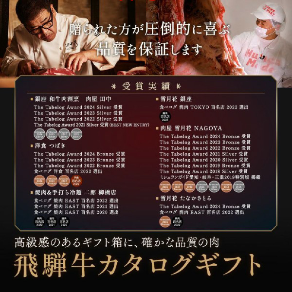 「おいしい肉を、お腹いっぱい食べて欲しい」「和牛の本当の美味しさを伝えたい」そんな思いから国産和牛(松阪牛・黒毛和牛・飛騨牛・近江牛)を集めました。精肉店だからできる誰にでも親しみやすい上質なお肉を扱うことで、家族で楽しめるおいしいお肉をご提供。一頭買いにこだわり、グルメな方の期待にも応える最高な技術と安定した品質を自信をもってお贈りします。ミシュラン掲載・食べログ受賞歴多数のレストランを含店舗運営している肉師たなかさとるが贈るカタログギフト。高級感のあるギフトボックスで、確かな品質と感動を。