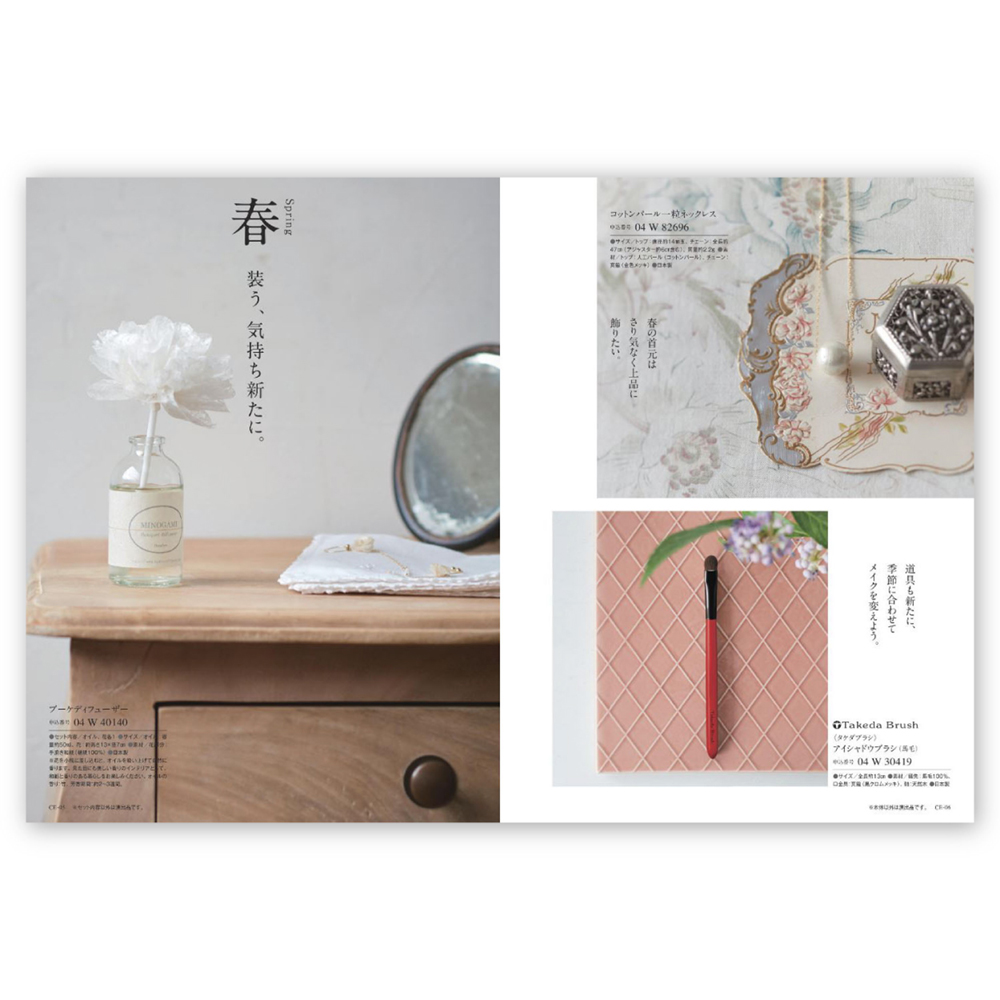 雑貨、グルメ、体験など幅広いラインナップが魅力の総合カタログギフト。春夏秋冬に合わせたおすすめアイテムの紹介や、暮らしを楽しむヒントにまつわる商品など読んでいるだけでも楽しい1冊です。