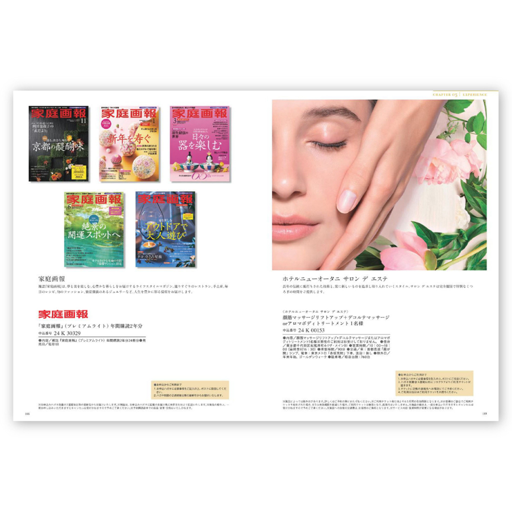 雑貨、グルメ、体験など幅広いラインナップが魅力の総合カタログギフト。春夏秋冬に合わせたおすすめアイテムの紹介や、暮らしを楽しむヒントにまつわる商品など読んでいるだけでも楽しい1冊です。