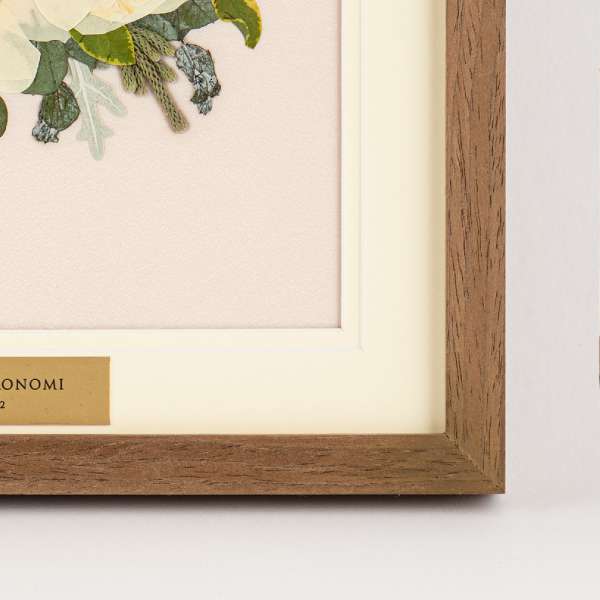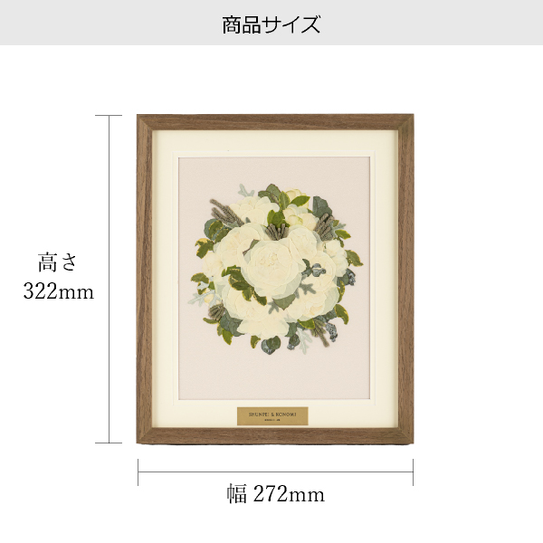 特許技術の乾燥方法で仕上げた押し花は、額の中で咲き続けるお花とともに、おふたりのお名前・記念日が刻まれ、たった一つの宝物に。