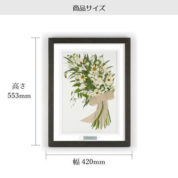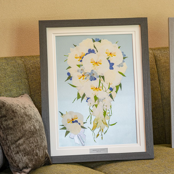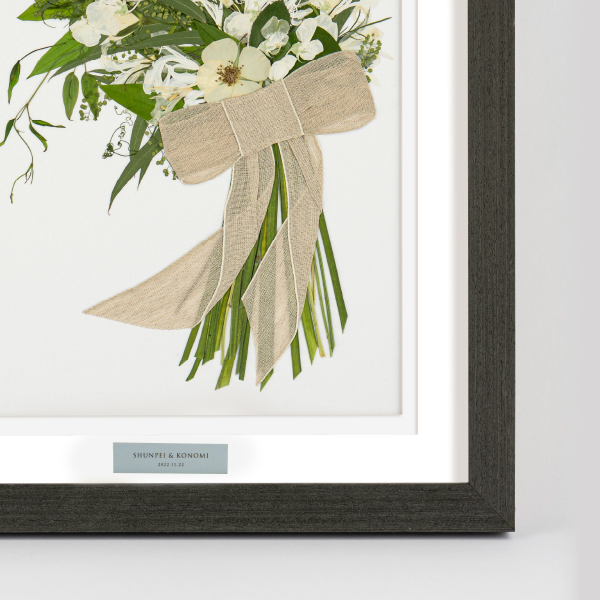 特許技術の乾燥方法で仕上げた押し花は、額の中で咲き続けるお花とともに、おふたりのお名前・記念日が刻まれ、たった一つの宝物に。
