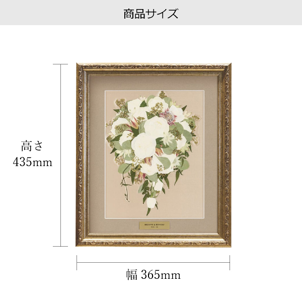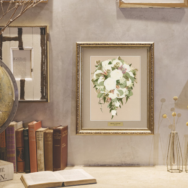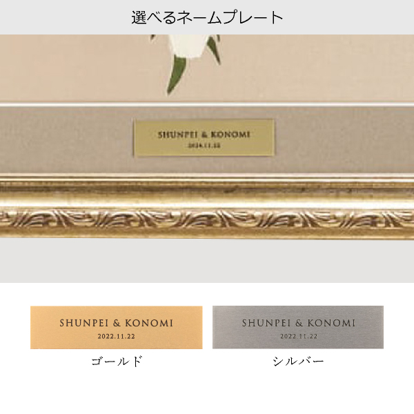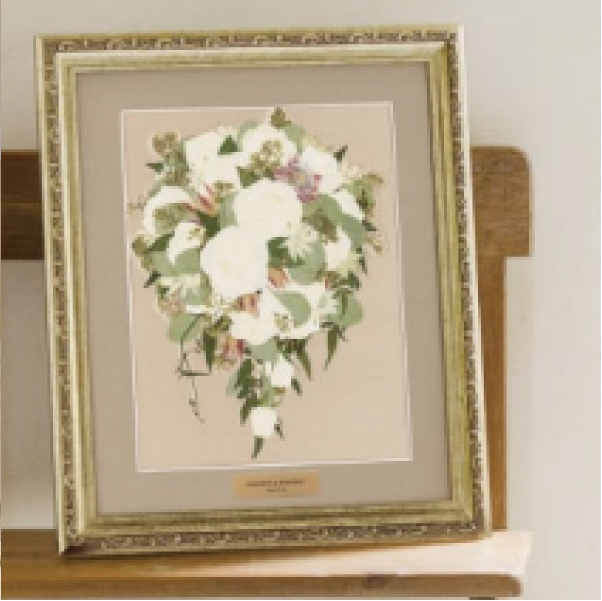 中でも、特許技術の乾燥方法で仕上げた押し花は、額の中で咲き続けるお花とともに、おふたりのお名前・記念日が刻まれ、たった一つの宝物になります。