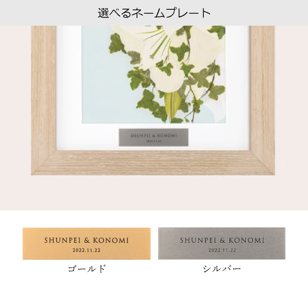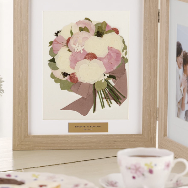 中でも、特許技術の乾燥方法で仕上げた押し花は、額の中で咲き続けるお花とともに、おふたりのお名前・記念日が刻まれ、たった一つの宝物になります。
