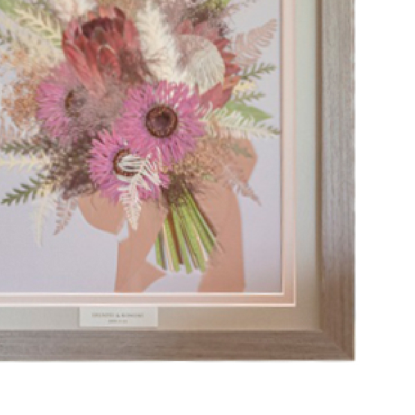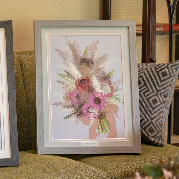特許技術の乾燥方法で仕上げた押し花は、おふたりの愛のしるしとして額の中で美しく咲き続けます。プレートにはおふたりのお名前・記念日が刻まれ、たった一つの宝物になります。