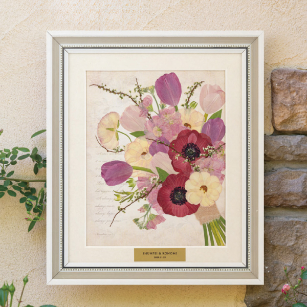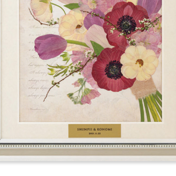 特許技術の乾燥方法で仕上げた押し花は、おふたりの愛のしるしとして額の中で美しく咲き続けます。プレートにはおふたりのお名前・記念日が刻まれ、たった一つの宝物になります。