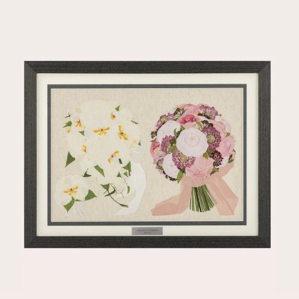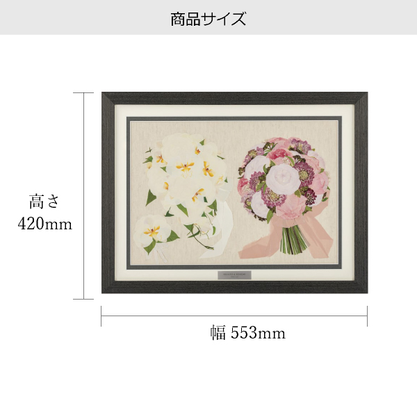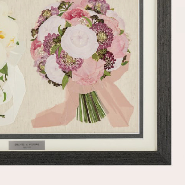 中でも、特許技術の乾燥方法で仕上げた押し花は、額の中で咲き続けるお花とともに、おふたりのお名前・記念日が刻まれ、たった一つの宝物になります。