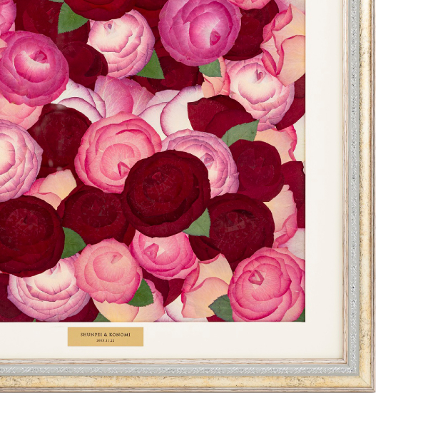 中でも、特許技術の乾燥方法で仕上げた押し花は、額の中で咲き続けるお花とともに、おふたりのお名前・記念日が刻まれ、たった一つの宝物になります。
